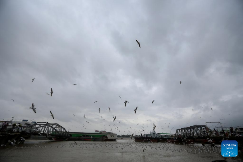 Gulls fly over a river near a jetty in Yangon, Myanmar, March 22, 2022. Tropical storm Asani has crossed Myanmar's delta region starting from Haiggyikyun, an island located at the mouth of the Pathein River, on Tuesday, according to the country's state weather department. (Xinhua/U Aung)