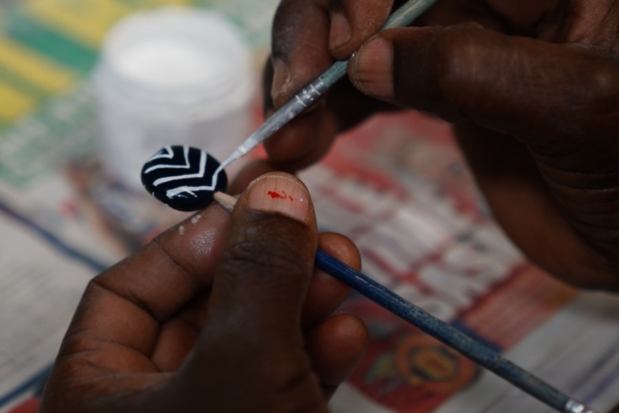 A woman works at the Kazuri workshop in Nairobi, Kenya, on March 21, 2022. (Xinhua/Dong Jianghui)