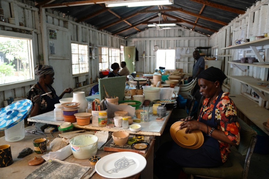 Women work at the Kazuri workshop in Nairobi, Kenya, on March 21, 2022. (Xinhua/Dong Jianghui)