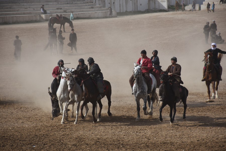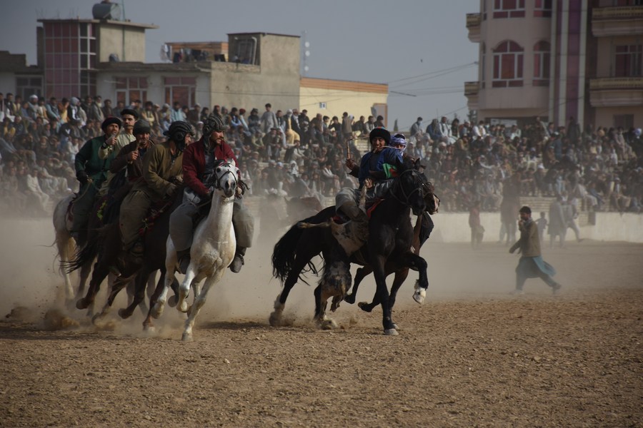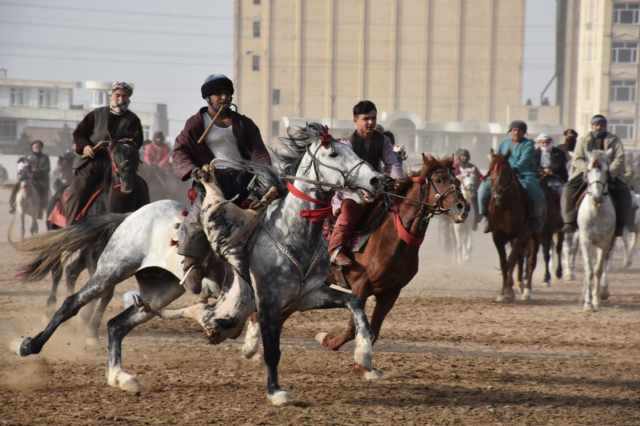 KABUL, March 23 (Xinhua) -- Buzkashi, meaning "goat grabbing," is a centuries-old traditional game in Afghanistan, in which skilled horse riders of rival teams compete to take the slaughtered goat or calf and throw it in a circle fixed on the Buzkashi ground.