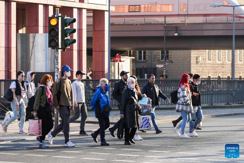 People cross a street in Berlin, capital of Germany, on March 24, 2022. (Photo by Stefan Zeitz/Xinhua)