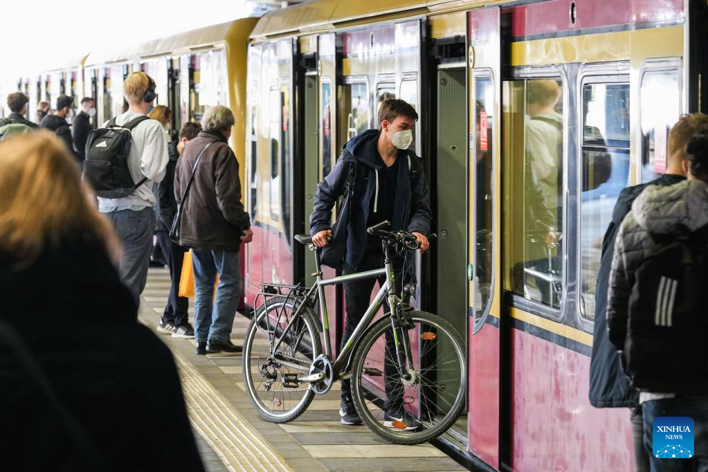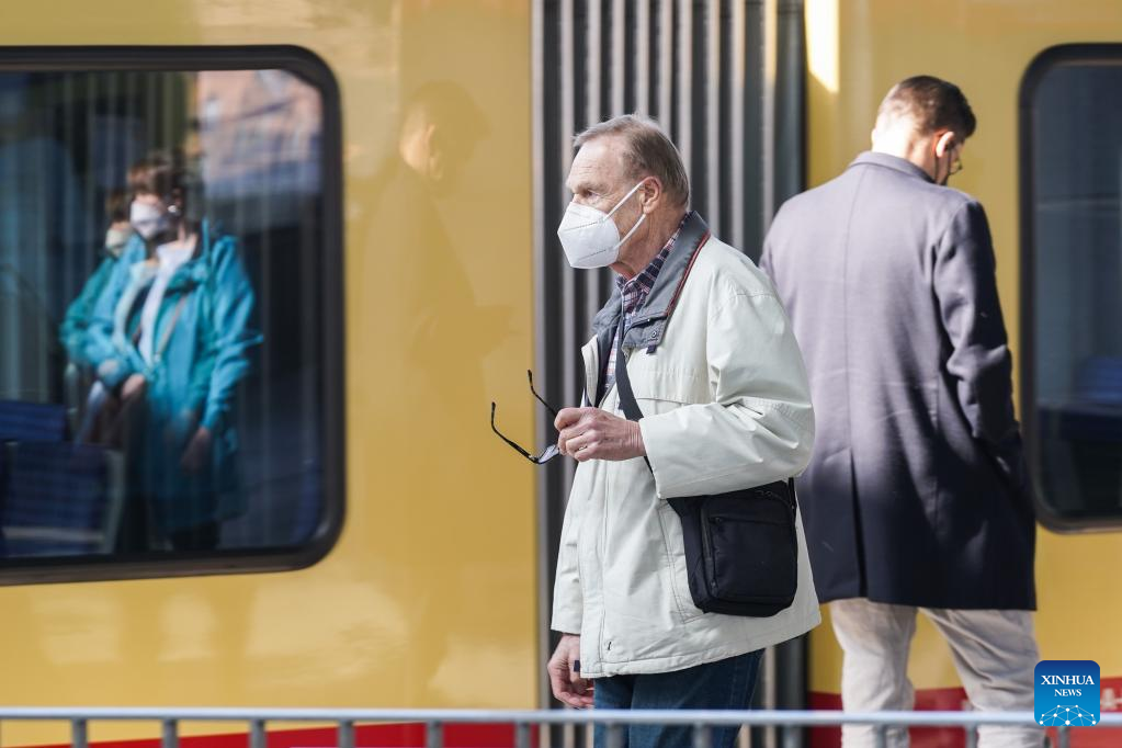 Passengers wearing face masks are seen on a platform of a station in Berlin, capital of Germany, on March 24, 2022. (Photo by Stefan Zeitz/Xinhua)