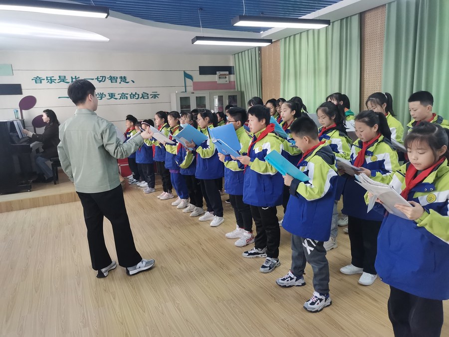Yang Bo instructs the students to practice chorus in the music classroom of Sanshitou Township Central Primary School in Hefei, east China's Anhui Province, March 10, 2022. (Xinhua/Liu Fangqiang)