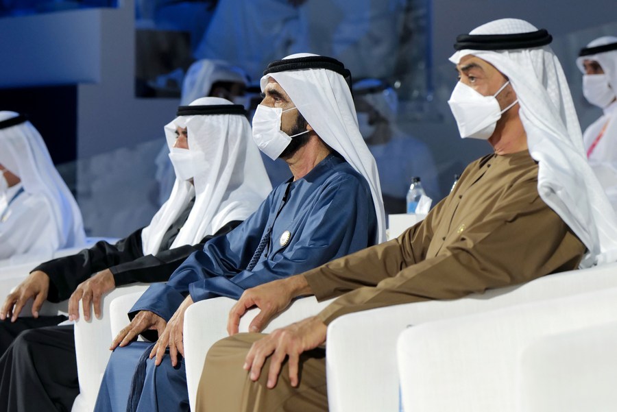 Sheikh Mohammed bin Rashid al Maktoum (2nd R), vice president and prime minister of the United Arab Emirates (UAE) and ruler of Dubai, and Abu Dhabi Crown Prince Sheikh Mohammed bin Zayed Al Nahyan (1st R) attend the opening ceremony of the Expo 2020 Dubai in Dubai, the United Arab Emirates, Sept. 30, 2021. (Xinhua)