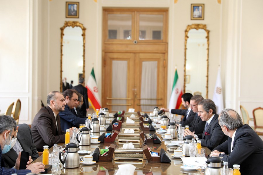 Iranian Foreign Minister Hossein Amir Abdollahian (3rd L) meets with the International Atomic Energy Agency (IAEA) Director General Rafael Grossi (2nd R) in Tehran, Iran, on March 5, 2022. (Iranian Foreign Ministry/Handout via Xinhua)