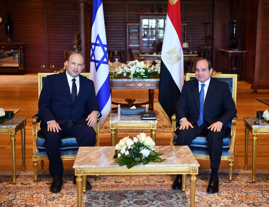 Egyptian President Abdel-Fattah al-Sisi (R) meets with Israeli Prime Minister Naftali Bennett in Sharm El-Sheikh, Egypt, on Sept. 13, 2021. (Egyptian Presidency/Handout via Xinhua)
