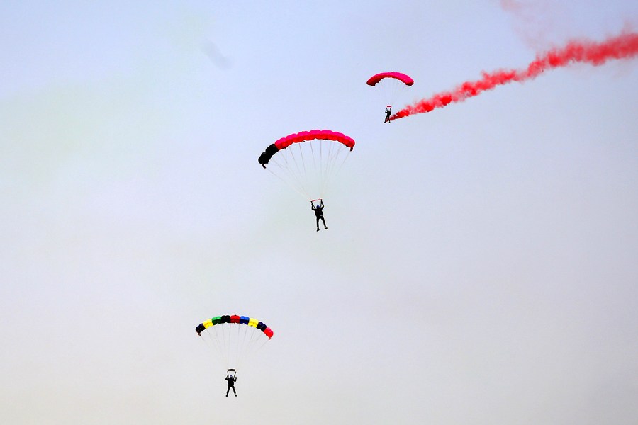 Parachutists perform during the Pakistan Day military parade in Islamabad, capital of Pakistan on March 23, 2022. (Xinhua/Ahmad Kamal)