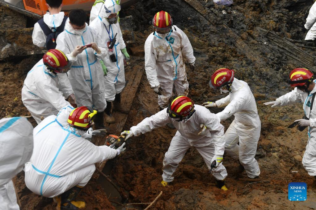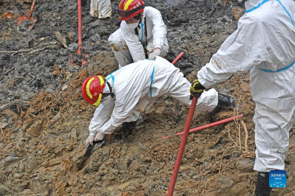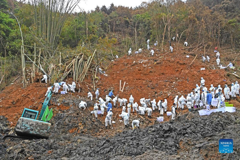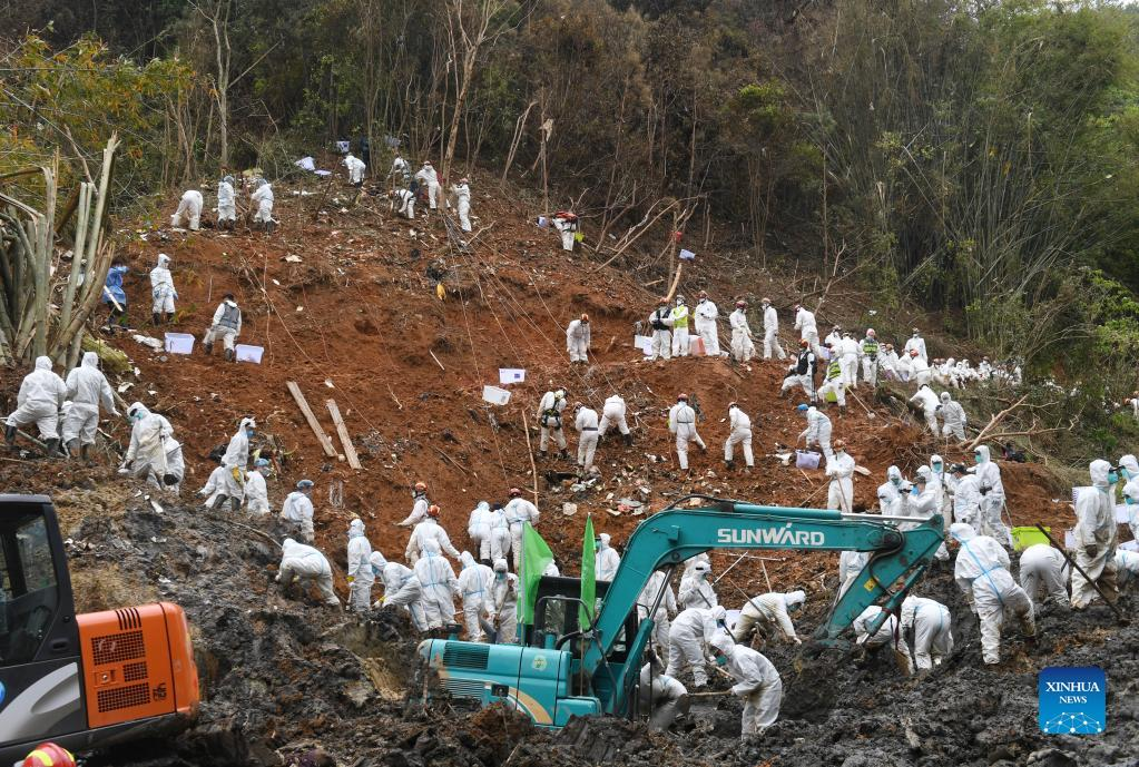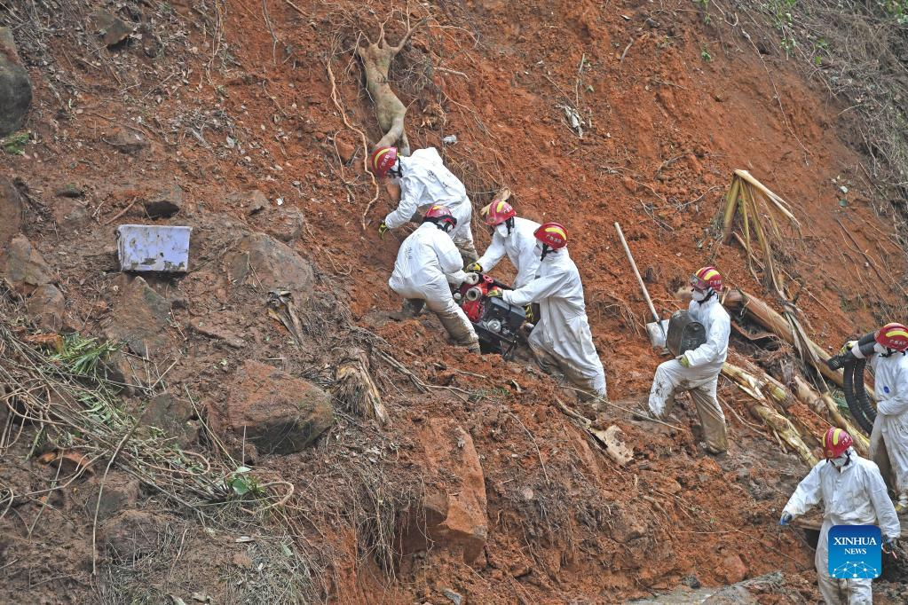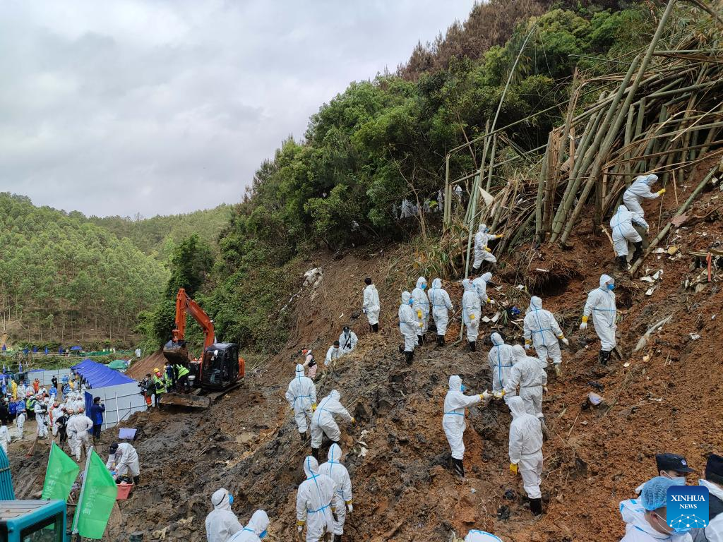 Rescuers conduct search and rescue work at the core site of the plane crash in Tengxian County, south China's Guangxi Zhuang Autonomous Region, March 25, 2022. The core site of the recent plane crash in south China will be excavated as all-out efforts are made to continue searching for survivors and the second black box, officials said at a news briefing on Friday. The China Eastern Airlines Boeing 737 aircraft carrying 132 people crashed on the afternoon of March 21 in a mountainous area of Guangxi's Tengxian County. No survivors have been found so far. One black box has already been recovered. (Xinhua/Zhou Hua)