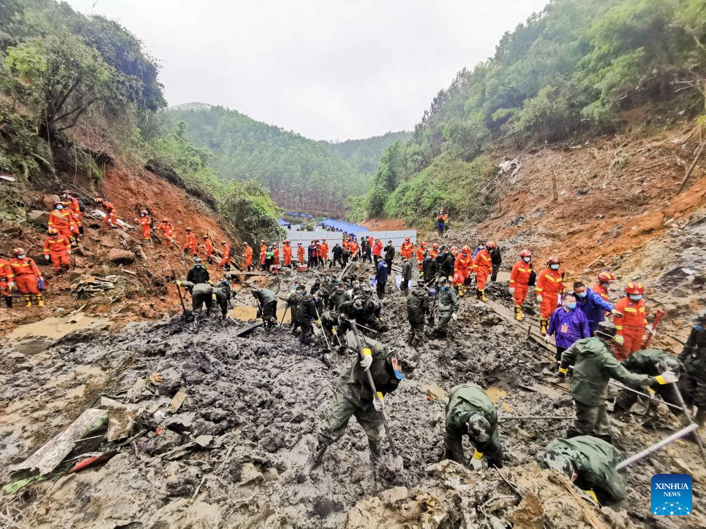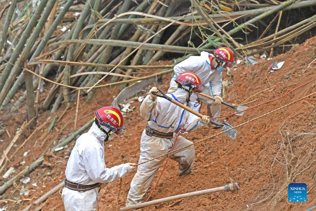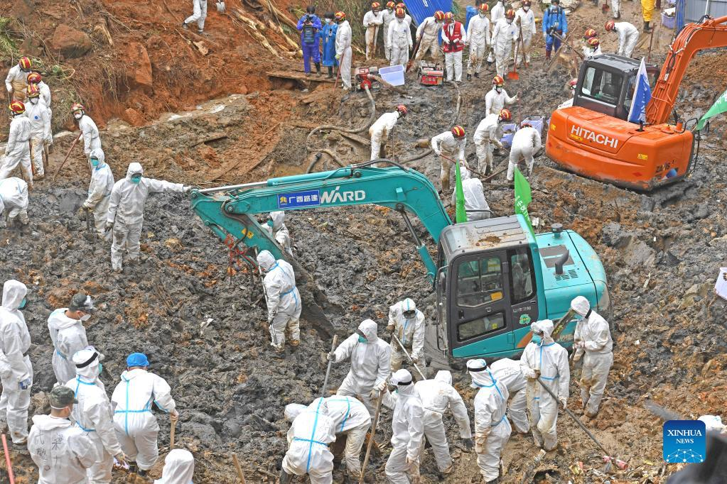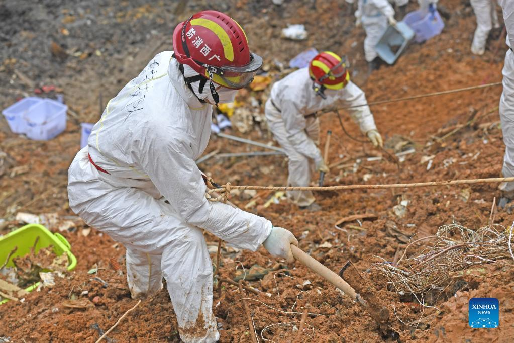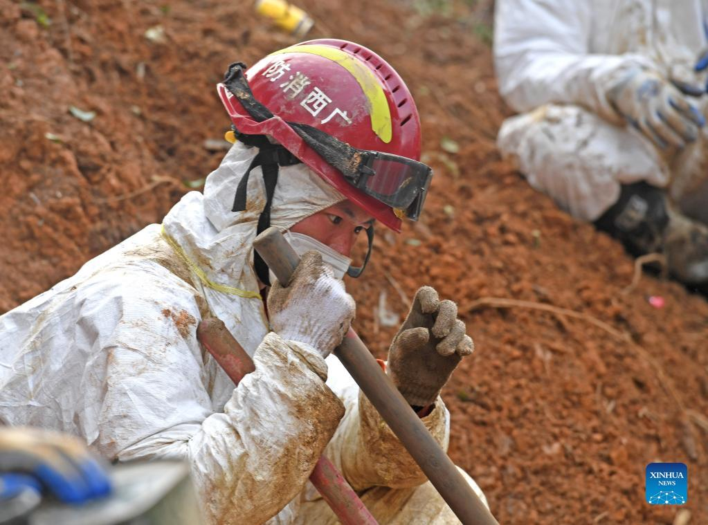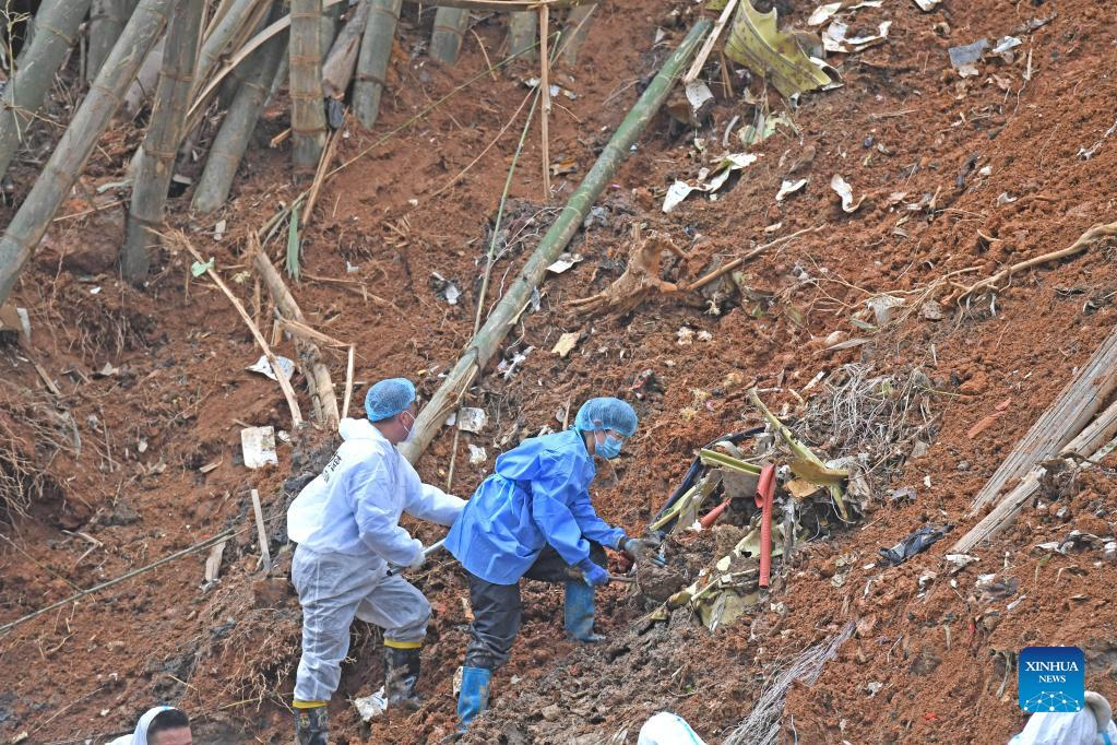 Rescuers conduct search and rescue work at the core site of the plane crash in Tengxian County, south China's Guangxi Zhuang Autonomous Region, March 25, 2022. The core site of the recent plane crash in south China will be excavated as all-out efforts are made to continue searching for survivors and the second black box, officials said at a news briefing on Friday. The China Eastern Airlines Boeing 737 aircraft carrying 132 people crashed on the afternoon of March 21 in a mountainous area of Guangxi's Tengxian County. No survivors have been found so far. One black box has already been recovered. (Xinhua/Zhou Hua)