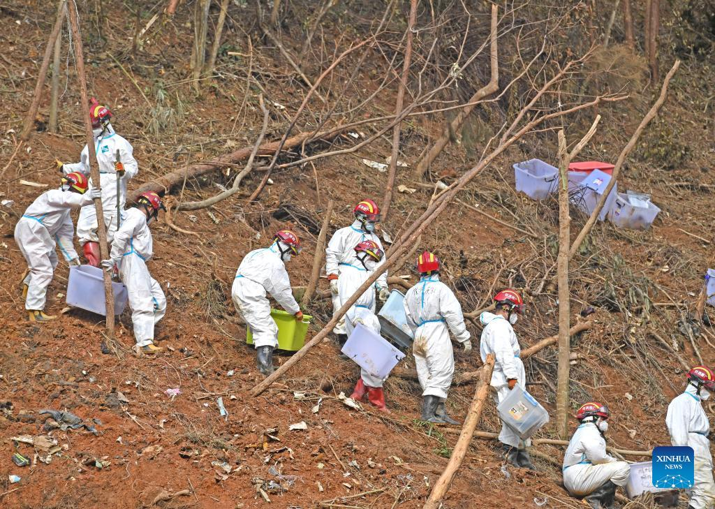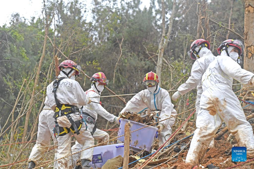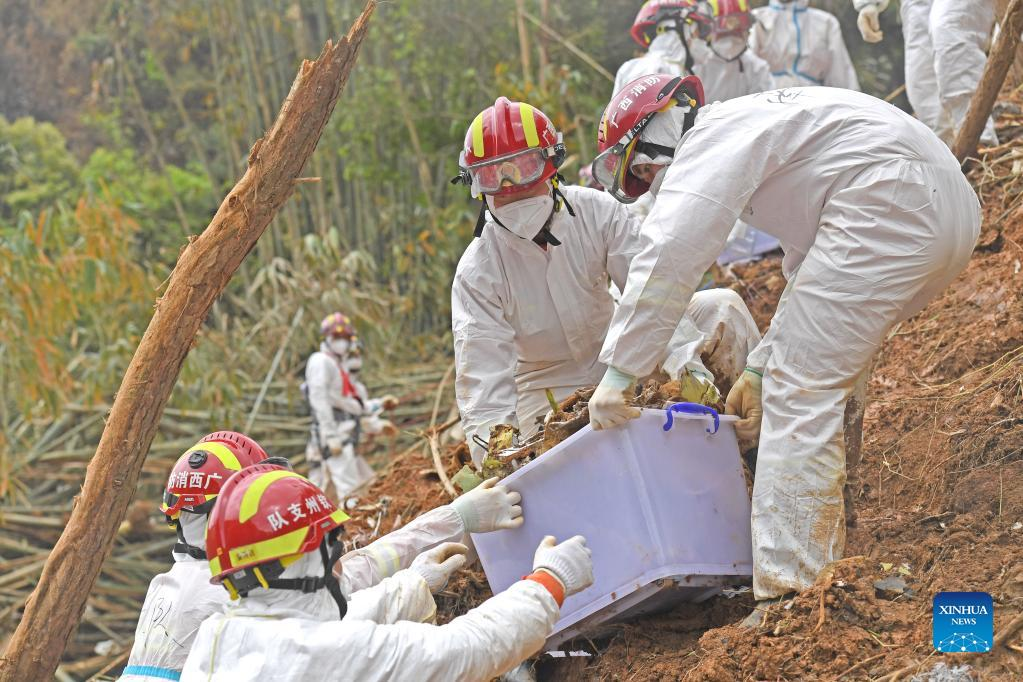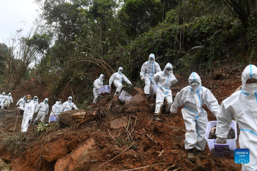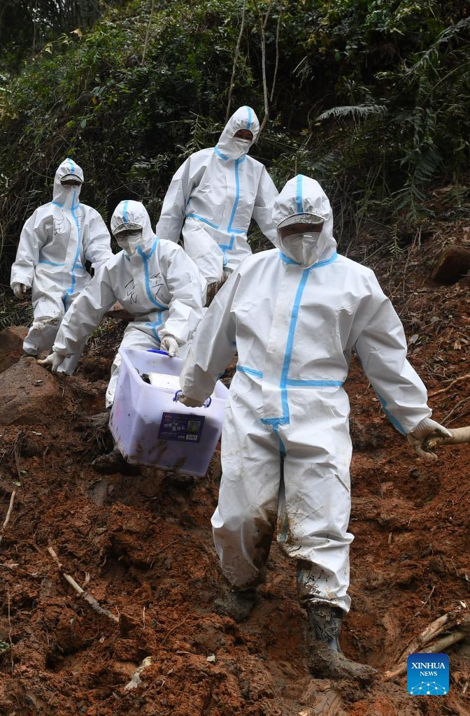 Rescuers transport objects collected at the core site of the plane crash in Tengxian County, south China's Guangxi Zhuang Autonomous Region, March 25, 2022. The core site of the recent plane crash in south China will be excavated as all-out efforts are made to continue searching for survivors and the second black box, officials said at a news briefing on Friday. The China Eastern Airlines Boeing 737 aircraft carrying 132 people crashed on the afternoon of March 21 in a mountainous area of Guangxi's Tengxian County. No survivors have been found so far. One black box has already been recovered. (Xinhua/Lu Boan)