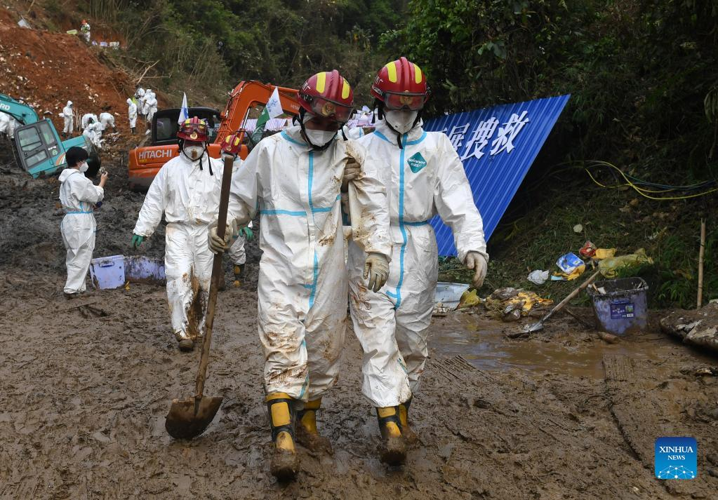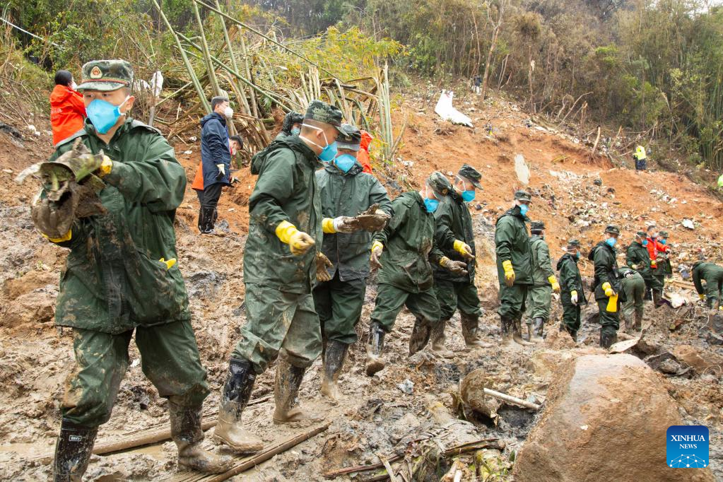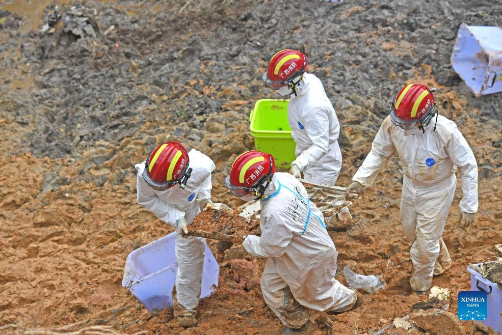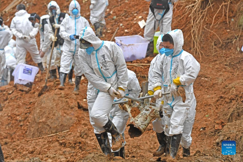 Rescuers transport objects collected at the core site of the plane crash in Tengxian County, south China's Guangxi Zhuang Autonomous Region, March 25, 2022. The core site of the recent plane crash in south China will be excavated as all-out efforts are made to continue searching for survivors and the second black box, officials said at a news briefing on Friday. The China Eastern Airlines Boeing 737 aircraft carrying 132 people crashed on the afternoon of March 21 in a mountainous area of Guangxi's Tengxian County. No survivors have been found so far. One black box has already been recovered. (Xinhua/Lu Boan)