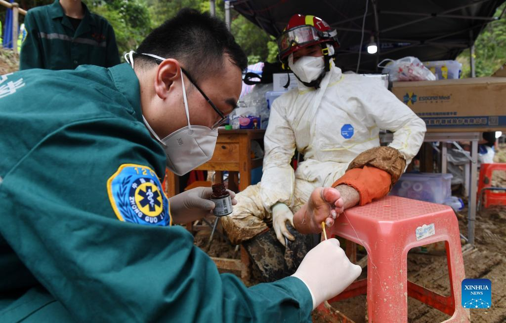 A medical worker treats wounds for an injured rescuer at a plane crash site in Tengxian County, south China's Guangxi Zhuang Autonomous Region, March 25, 2022. The core site of the recent plane crash in south China will be excavated as all-out efforts are made to continue searching for survivors and the second black box, officials said at a news briefing on Friday. The China Eastern Airlines Boeing 737 aircraft carrying 132 people crashed on the afternoon of March 21 in a mountainous area of Guangxi's Tengxian County. No survivors have been found so far. One black box has already been recovered. (Xinhua/Lu Boan)
