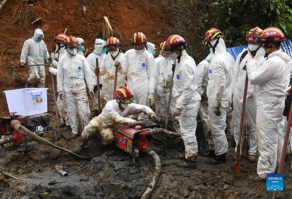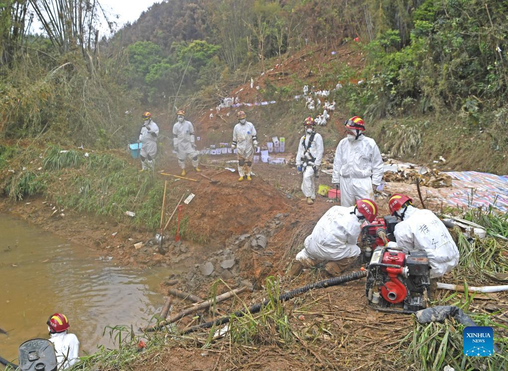 Rescuers use a water pump to conduct search and rescue work at the core site of the plane crash in Tengxian County, south China's Guangxi Zhuang Autonomous Region, March 25, 2022. The core site of the recent plane crash in south China will be excavated as all-out efforts are made to continue searching for survivors and the second black box, officials said at a news briefing on Friday. The China Eastern Airlines Boeing 737 aircraft carrying 132 people crashed on the afternoon of March 21 in a mountainous area of Guangxi's Tengxian County. No survivors have been found so far. One black box has already been recovered. (Xinhua/Lu Boan)