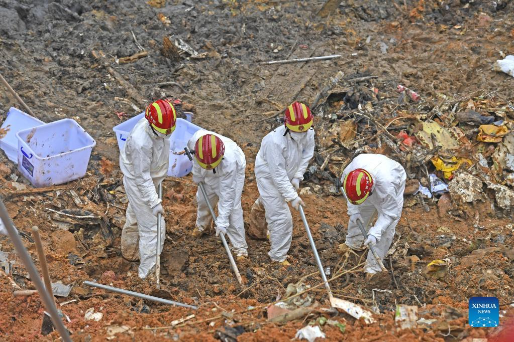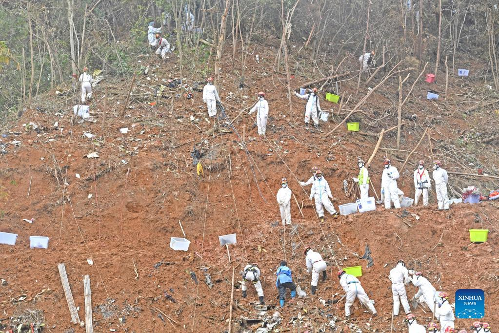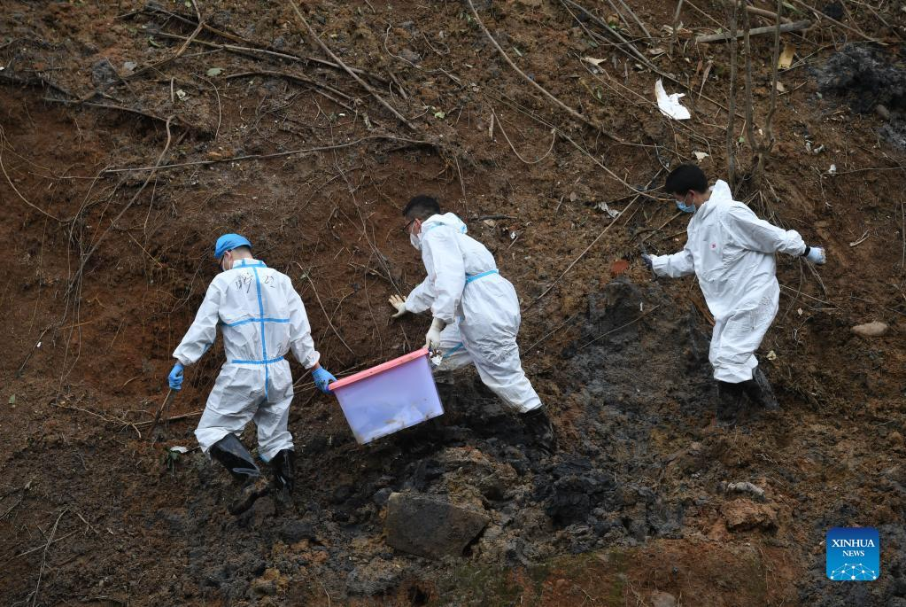 Rescuers identify objects collected at the core site of the plane crash in Tengxian County, south China's Guangxi Zhuang Autonomous Region, March 25, 2022. The core site of the recent plane crash in south China will be excavated as all-out efforts are made to continue searching for survivors and the second black box, officials said at a news briefing on Friday. The China Eastern Airlines Boeing 737 aircraft carrying 132 people crashed on the afternoon of March 21 in a mountainous area of Guangxi's Tengxian County. No survivors have been found so far. One black box has already been recovered. (Xinhua/Lu Boan)
