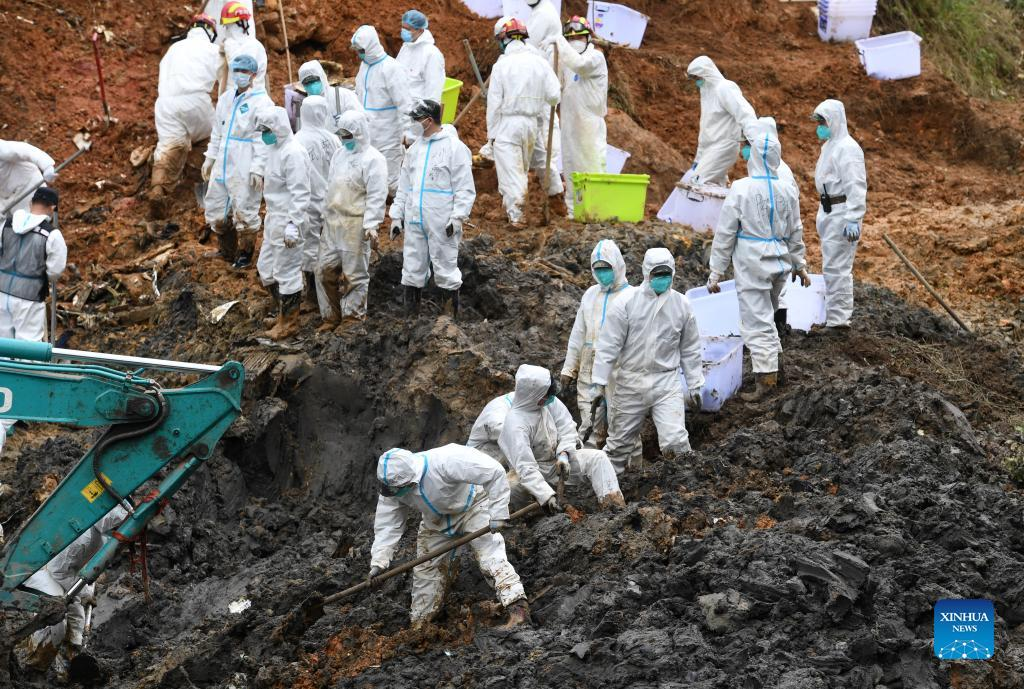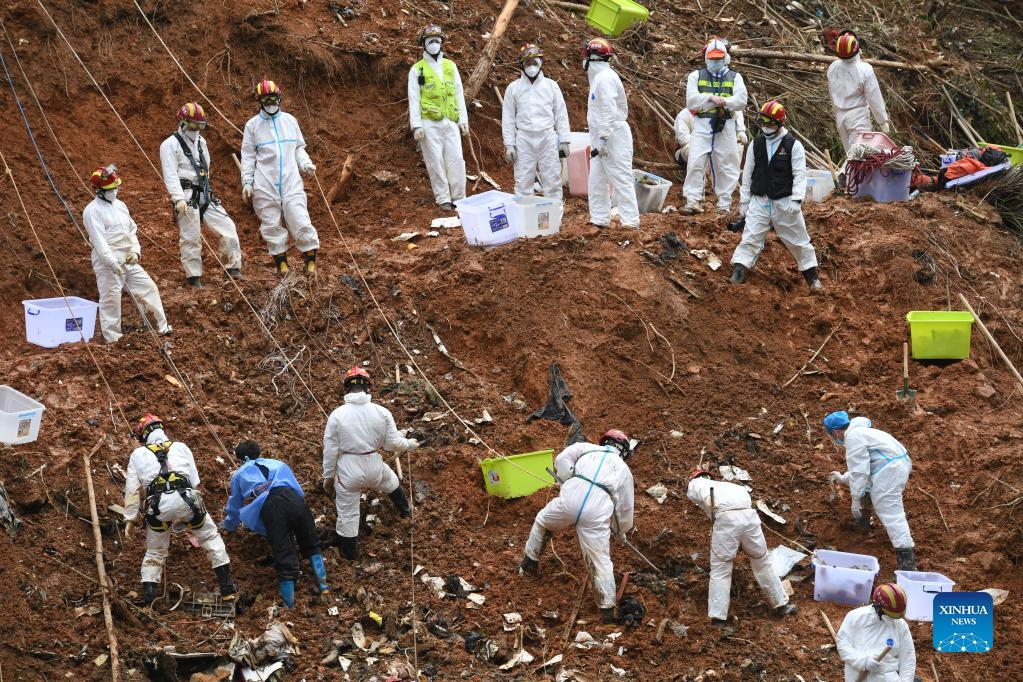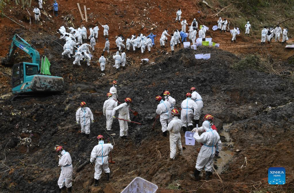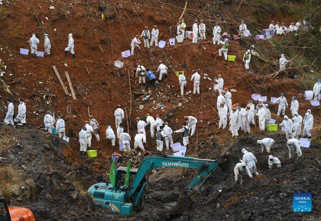 Rescuers conduct search and rescue work at the core site of the plane crash in Tengxian County, south China's Guangxi Zhuang Autonomous Region, March 25, 2022. The core site of the recent plane crash in south China will be excavated as all-out efforts are made to continue searching for survivors and the second black box, officials said at a news briefing on Friday. The China Eastern Airlines Boeing 737 aircraft carrying 132 people crashed on the afternoon of March 21 in a mountainous area of Guangxi's Tengxian County. No survivors have been found so far. One black box has already been recovered. (Xinhua/Lu Boan)