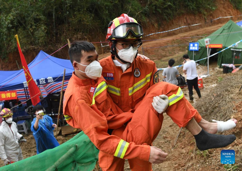 A rescuer suffering from heat stroke is helped out of the core site of the plane crash in Tengxian County, south China's Guangxi Zhuang Autonomous Region, March 25, 2022. The core site of the recent plane crash in south China will be excavated as all-out efforts are made to continue searching for survivors and the second black box, officials said at a news briefing on Friday. The China Eastern Airlines Boeing 737 aircraft carrying 132 people crashed on the afternoon of March 21 in a mountainous area of Guangxi's Tengxian County. No survivors have been found so far. One black box has already been recovered. (Xinhua/Lu Boan)