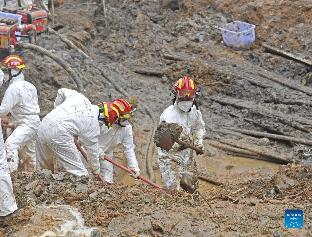 Rescuers work at the core site of the plane crash in Tengxian County, south China's Guangxi Zhuang Autonomous Region, March 25, 2022. The core site of the recent plane crash in south China will be excavated as all-out efforts are made to continue searching for survivors and the second black box, officials said at a news briefing on Friday. The China Eastern Airlines Boeing 737 aircraft carrying 132 people crashed on the afternoon of March 21 in a mountainous area of Guangxi's Tengxian County. No survivors have been found so far. One black box has already been recovered. (Xinhua/Zhou Hua)