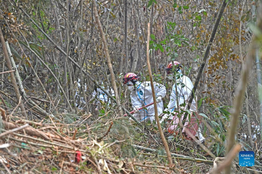 Rescuers transport pieces of plane wreckage at the core site of the plane crash in Tengxian County, south China's Guangxi Zhuang Autonomous Region, March 25, 2022. The core site of the recent plane crash in south China will be excavated as all-out efforts are made to continue searching for survivors and the second black box, officials said at a news briefing on Friday. The China Eastern Airlines Boeing 737 aircraft carrying 132 people crashed on the afternoon of March 21 in a mountainous area of Guangxi's Tengxian County. No survivors have been found so far. One black box has already been recovered. (Xinhua/Zhou Hua)
