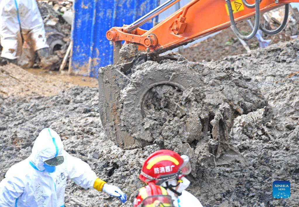 A rescuer pulls out a shoe stuck in the mud at the core site of the plane crash in Tengxian County, south China's Guangxi Zhuang Autonomous Region, March 25, 2022. The core site of the recent plane crash in south China will be excavated as all-out efforts are made to continue searching for survivors and the second black box, officials said at a news briefing on Friday. The China Eastern Airlines Boeing 737 aircraft carrying 132 people crashed on the afternoon of March 21 in a mountainous area of Guangxi's Tengxian County. No survivors have been found so far. One black box has already been recovered. (Xinhua/Zhou Hua)