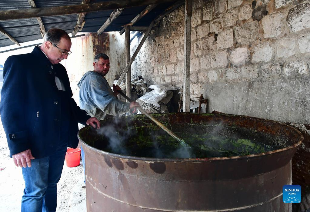 Mazen Zanabili (L), owner of the Zanabili soap factory, inspects the manufacturing of olive soap at his factory in the old city of Aleppo, northwestern Syria, on March 6, 2022. The Zanabili factory, the oldest olive soap factory in Aleppo named after the family who has been operating it since 1,000 years ago, suffered massive damages as it was located in a battle zone during the war. (Photo by Ammar Safarjalani/Xinhua)