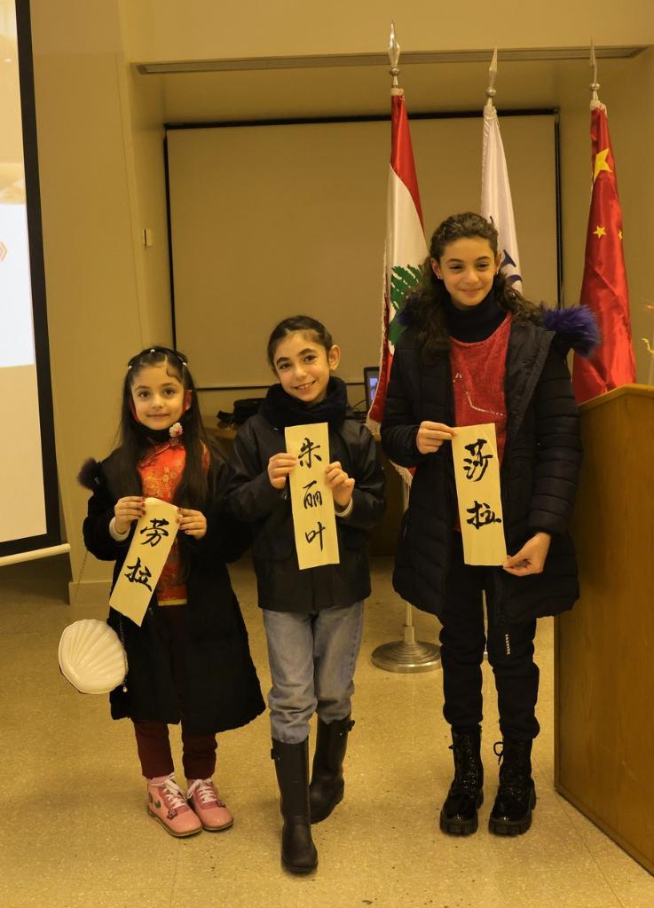Lebanese girls display their Chinese names at a ceremony celebrating the 15th anniversary of the Confucius Institute at the Saint Joseph University (USJ) in Beirut, Lebanon, on March 22, 2022. (Xinhua/Liu Zongya)