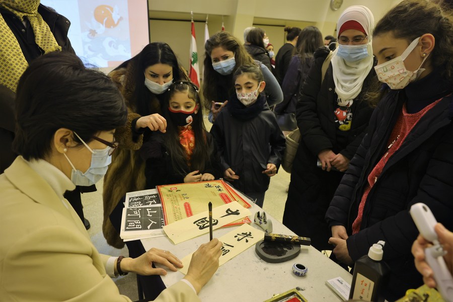 A Chinese teacher displays Chinese calligraphy at a ceremony celebrating the 15th anniversary of the Confucius Institute at the Saint Joseph University (USJ) in Beirut, Lebanon, on March 22, 2022. (Xinhua/Liu Zongya)