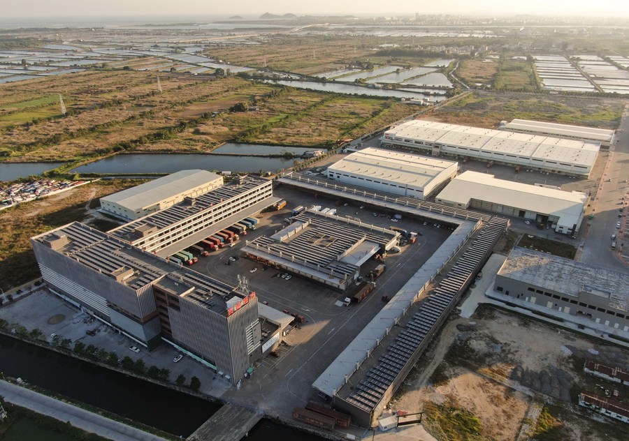 Aerial photo taken on Dec. 1, 2021 shows the logistics zone of a toy cultural and tourism industrial park in Chenghai District of Shantou City, south China's Guangdong Province. (Xinhua/Deng Hua)