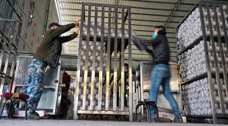 Workers produce edible fungi growing kits at an agricultural sci-tech company in Wuguanyi Township of Liuba County in Hanzhong, northwest China's Shaanxi Province, Feb. 24, 2022. (Xinhua/Tao Ming)