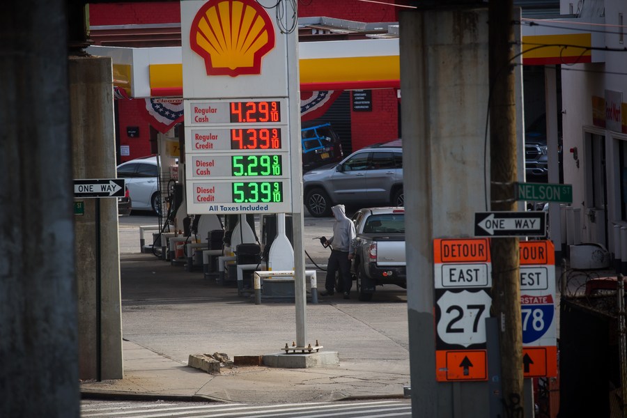 A person pumps gas at a gas station in the Brooklyn borough of New York, the United States, on March 8, 2022. (Photo by Michael Nagle/Xinhua)