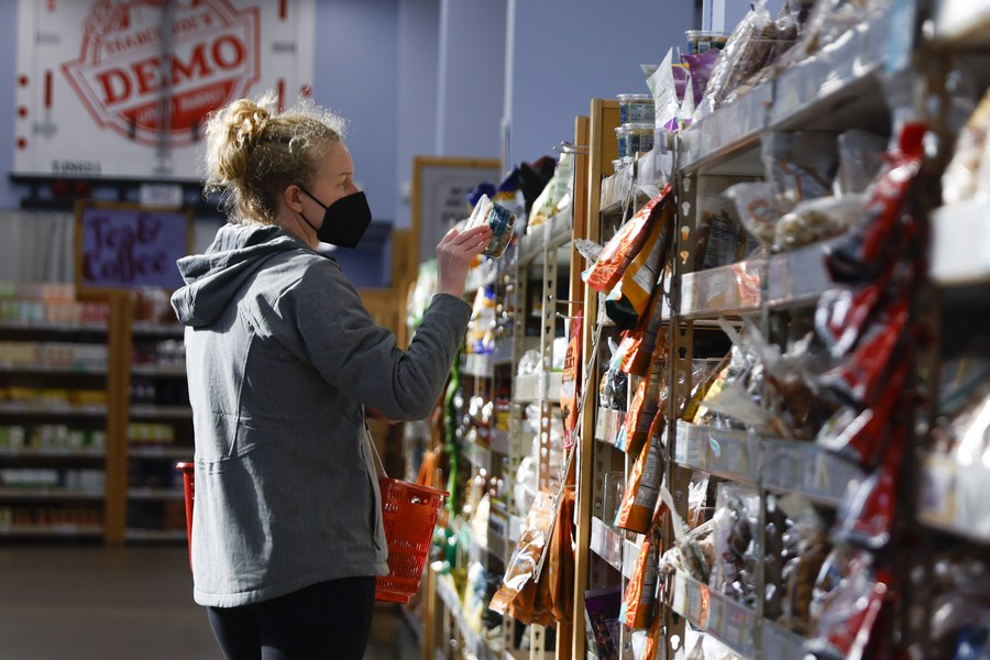 A consumer shops at a grocery store in Washington, D.C., the United States, March 10, 2022. (Photo by Ting Shen/Xinhua)