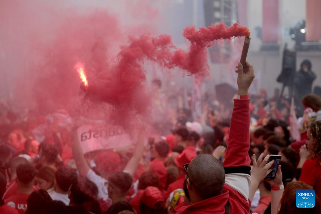Supporters of Malta's Labour Party celebrate the victory of the general election in Hamrun, Malta, on March 27, 2022. Malta's Labour Party has won the general election with a comfortable majority, Prime Minister Robert Abela announced on Sunday. (Photo by Jonathan Borg/Xinhua)