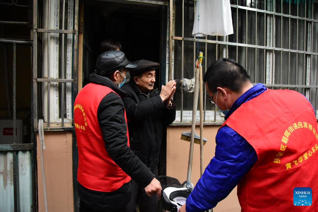 Jin Xingyong (C) expresses his gratitude to the motorcade volunteered to provide free rides for him in Hangzhou, east China's Zhejiang Province, Jan. 19, 2022. (Xinhua/Zheng Mengyu)