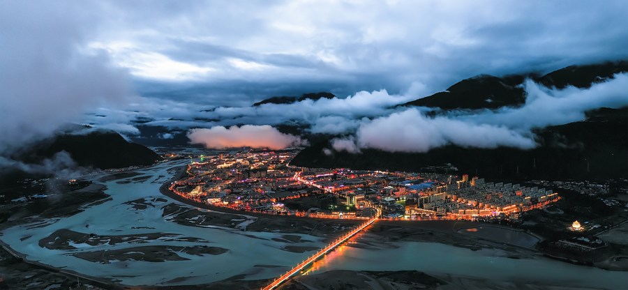Aerial photo taken on June 4, 2021 shows a night view of Nyingchi City of southwest China's Tibet Autonomous Region. (Photo by Dong Zhixiong/Xinhua)