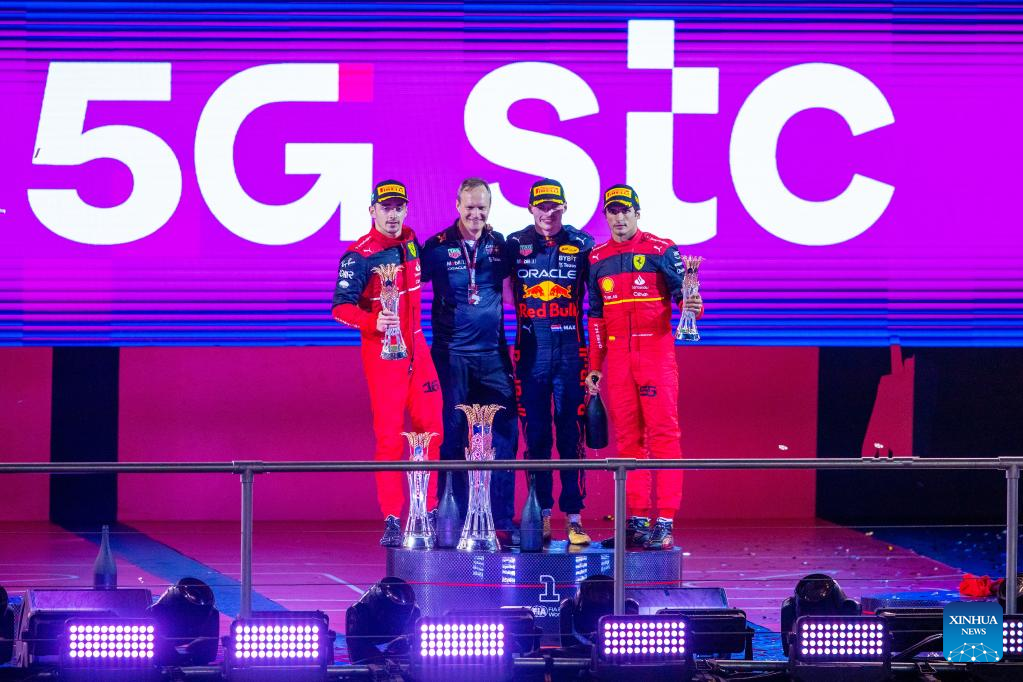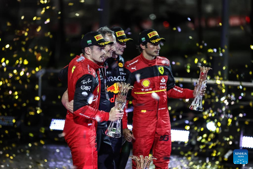 (From L to R)Ferrari's driver Charles Leclerc of Monaco, Red Bull Racing's Chief Engineer Paul Monaghan, Red Bull's driver Max Verstappen of the Netherlands and Ferrari's driver Carlos Sainz Jr. of Spain pose for pictures on the podium after during the 2022 Saudi Arabian Grand Prix at Jeddah Corniche Circuit in Jeddah, Saudi Arabia on March 27, 2022. (Saudi Ministry of Media/Handout via Xinhua)