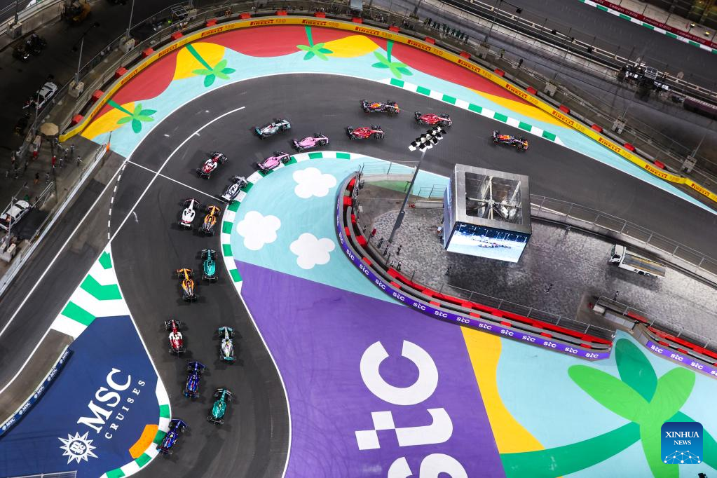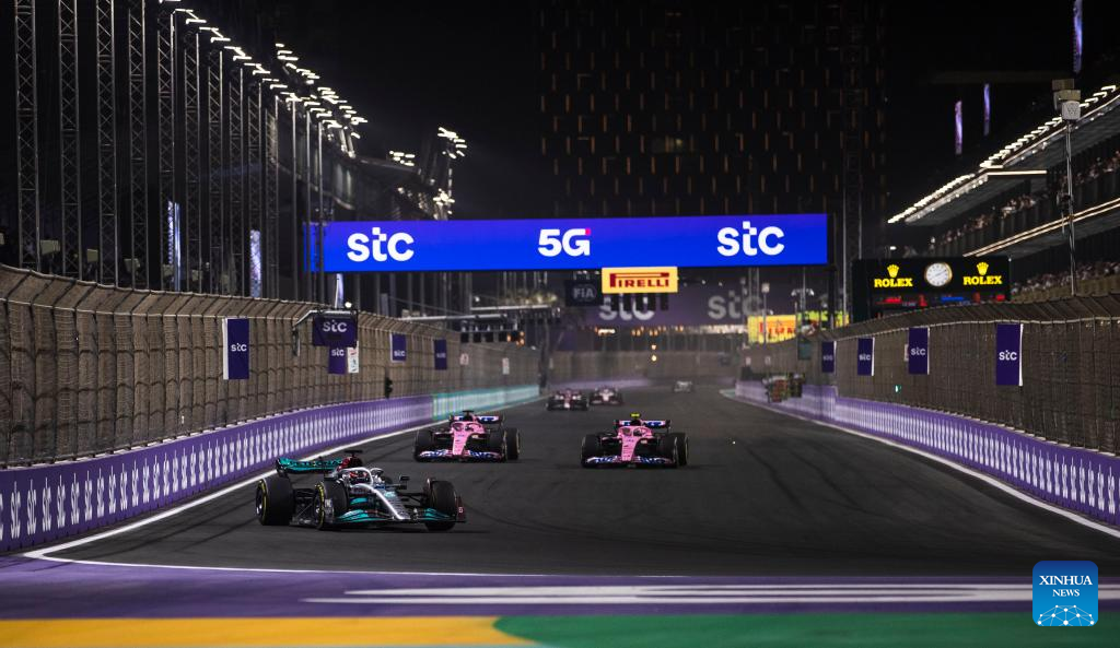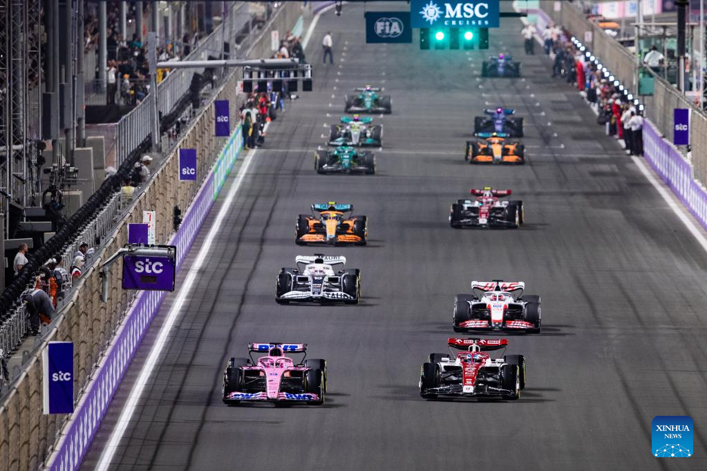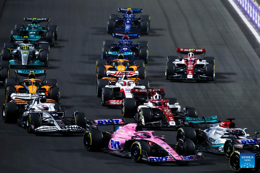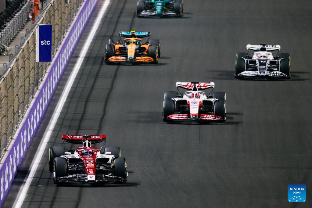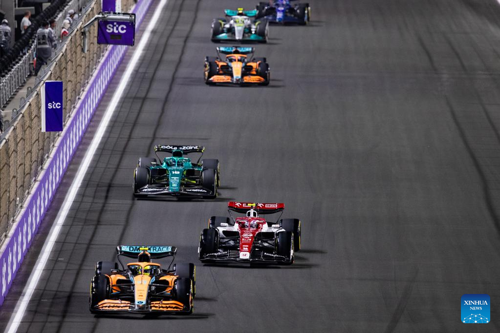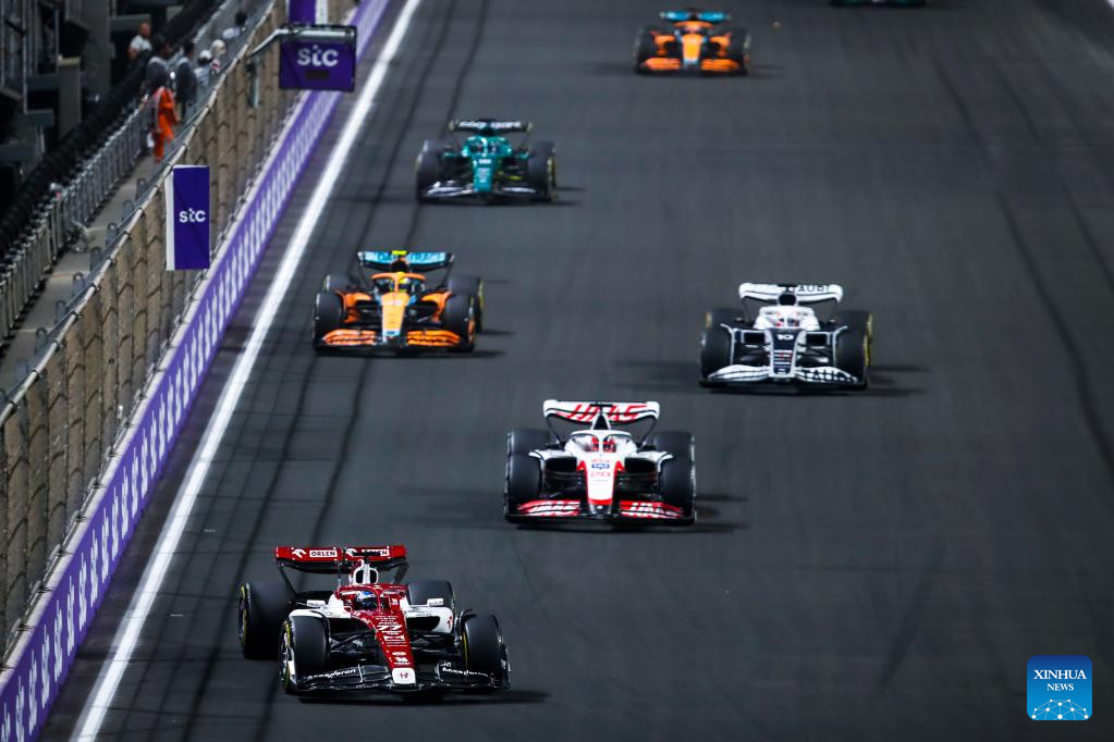 Drivers compete during the 2022 Saudi Arabian Grand Prix at Jeddah Corniche Circuit in Jeddah, Saudi Arabia on March 27, 2022. (DPPI/Handout via Xinhua)