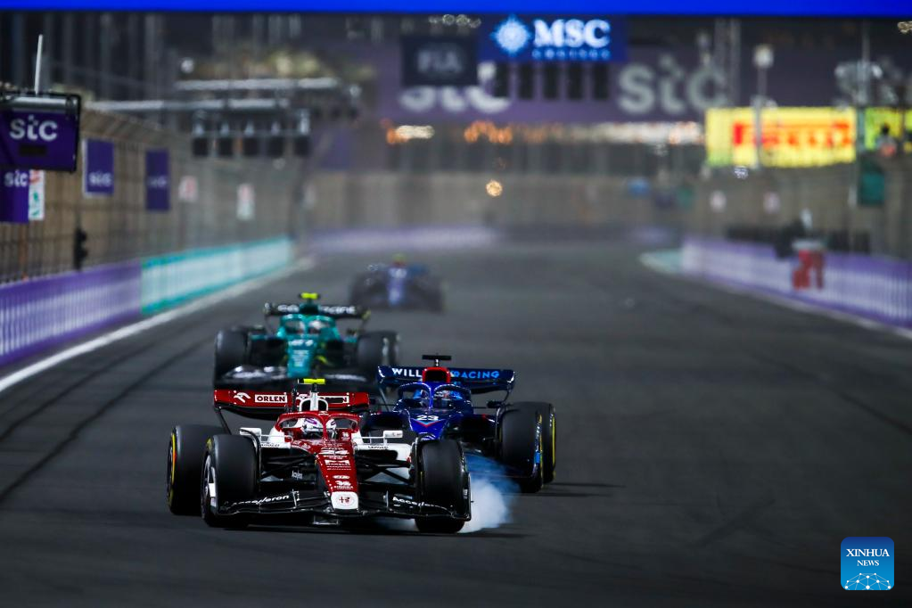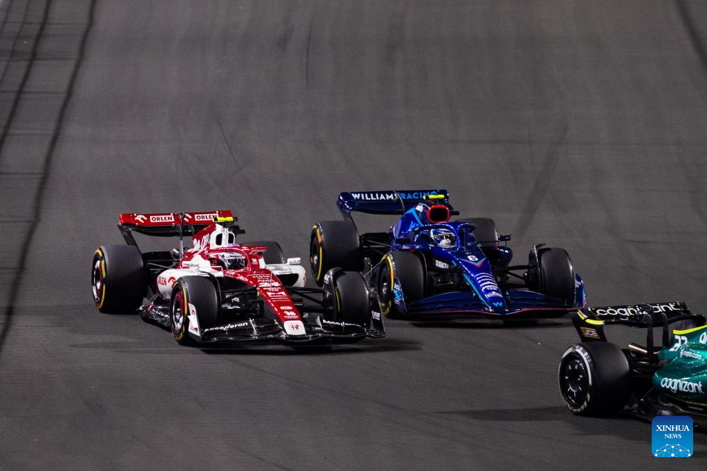 Alfa Romeo's Chinese driver Zhou Guanyu (L) competes during the 2022 Saudi Arabian Grand Prix at Jeddah Corniche Circuit in Jeddah, Saudi Arabia on March 27, 2022. (DPPI/Handout via Xinhua)