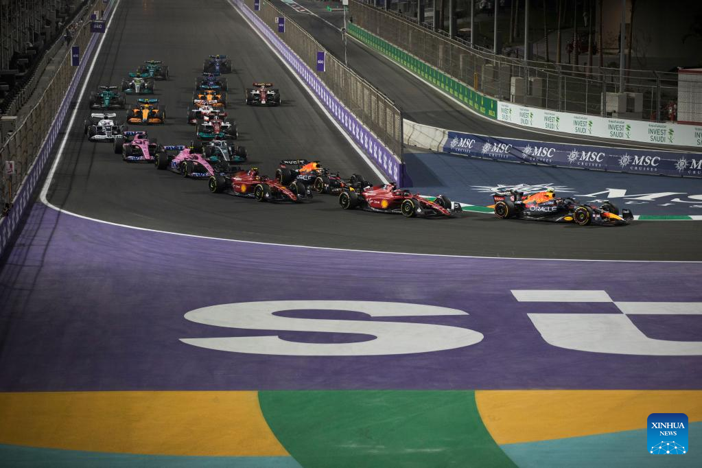 Drivers compete during the 2022 Saudi Arabian Grand Prix at Jeddah Corniche Circuit in Jeddah, Saudi Arabia on March 27, 2022. (Saudi Ministry of Media/Handout via Xinhua)