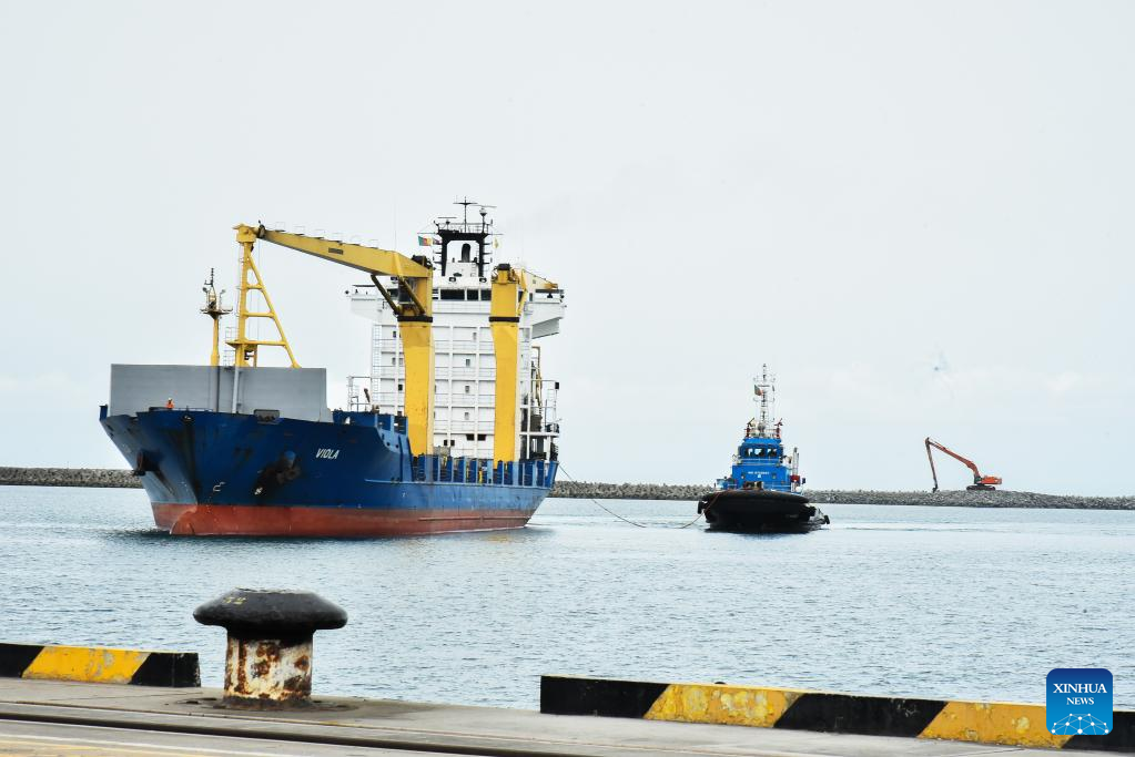 Photo taken on March 15, 2022 shows a boat docking at Kribi Deep Seaport, Kribi, Cameroon. (Photo by Kepseu/Xinhua)