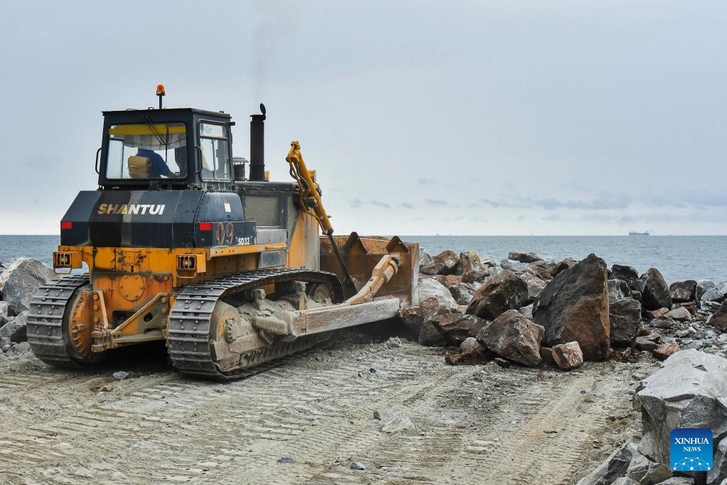 Photo taken on March 15, 2022 shows the construction site of the breakwater at Kribi Deep Seaport, Kribi, Cameroon. (Photo by Kepseu/Xinhua)