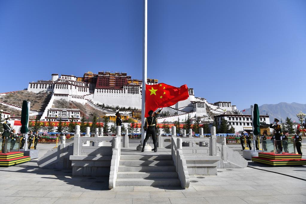 A flag-raising ceremony is held to celebrate the Serfs' Emancipation Day at the square in front of the Potala Palace in Lhasa, capital of southwest China's Tibet Autonomous Region, March 28, 2022. (Xinhua/Jigme Dorge)