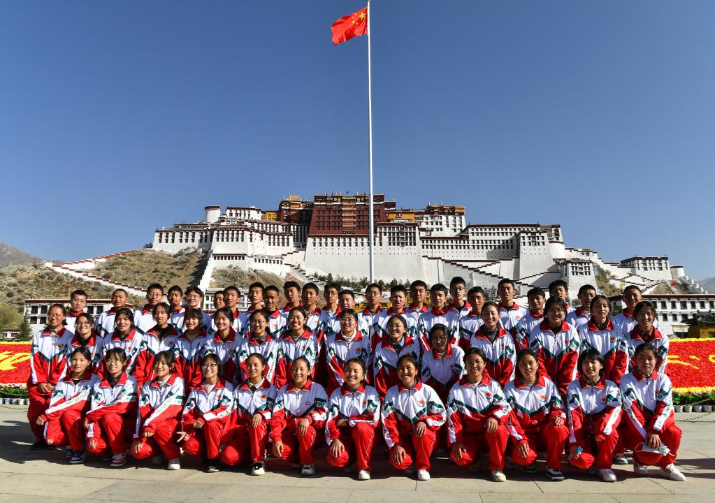 Students pose for a group photo after a flag-raising ceremony to celebrate the Serfs' Emancipation Day at the square in front of the Potala Palace in Lhasa, capital of southwest China's Tibet Autonomous Region, March 28, 2022. (Xinhua/Jigme Dorge)