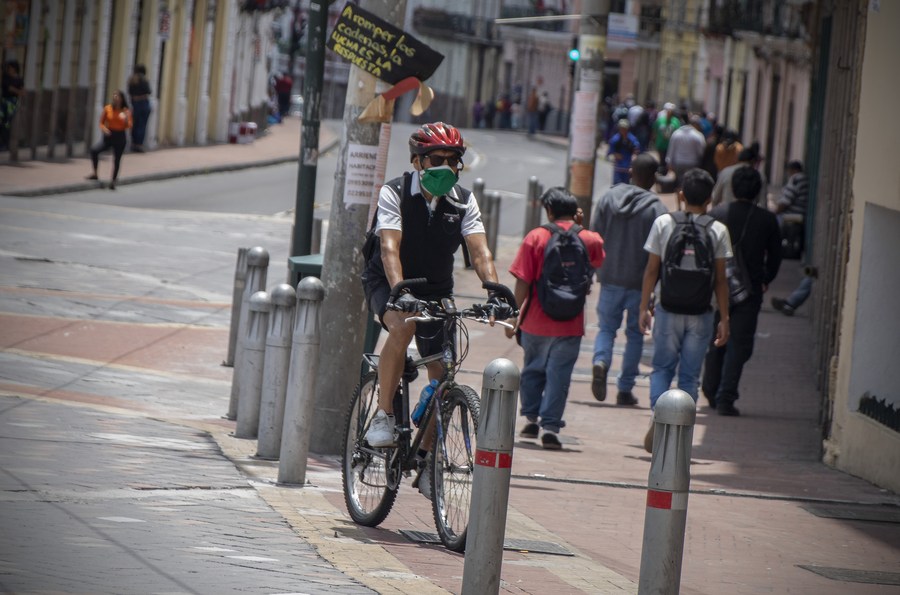 A man wearing a face mask rides a bicycle in a street in Quito, Ecuador, March 15, 2020. (Photo by Santiago Armas/Xinhua)