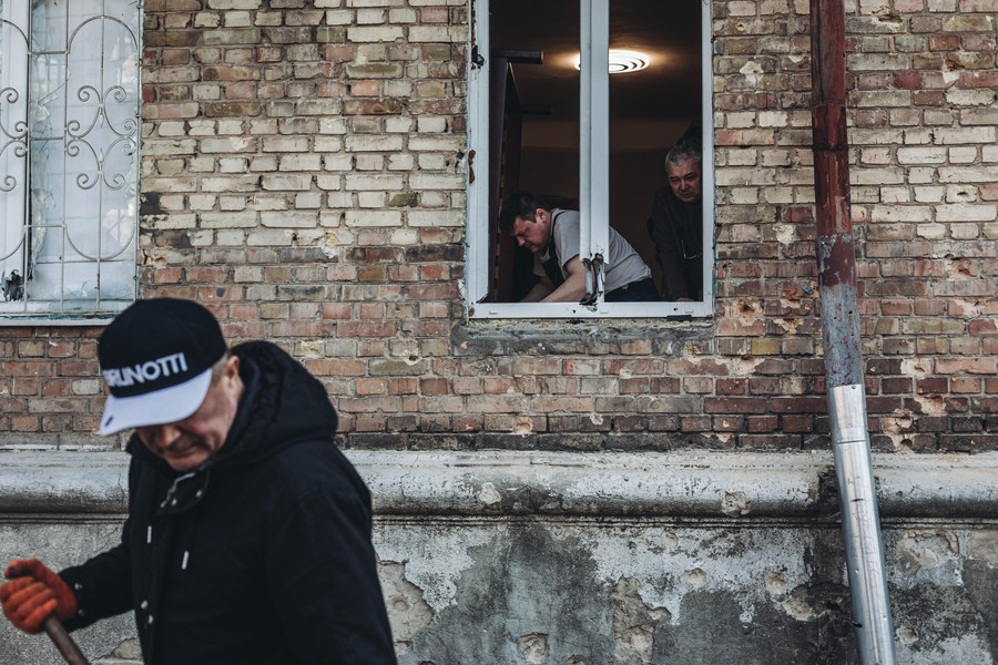 Residents clean a building in Kiev, Ukraine, March 23, 2022. (Photo by Diego Herrera/Xinhua)
