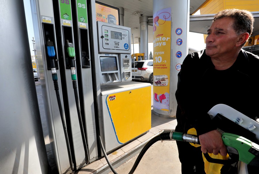 A man fuels a vehicle at a gas station in Tzemach near Tiberias, northern Israel, on Feb. 28, 2022. (Photo by Gil Cohen Magen/Xinhua)