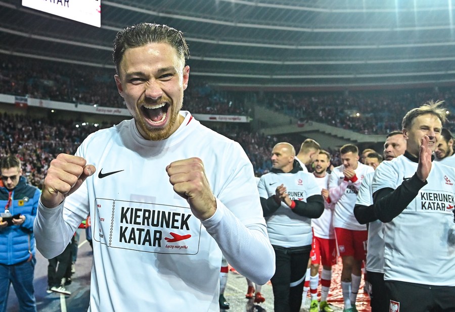 Matty Cash of Poland celebrates after winning the 2022 FIFA World Cup playoff qualifying match between against Sweden in Chorzow, Poland, March 29, 2022. (Photo by Lukasz Sobala/Xinhua)