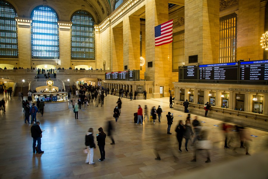 Pedestrians walk through the Grand Central station in New York, the United States, March 28, 2022. (Photo by Michael Nagle/Xinhua)
