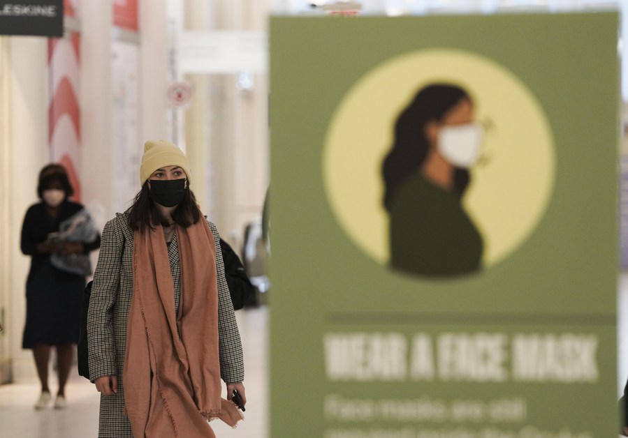 People walk past a signboard of wearing face masks at the Oculus of the World Trade Center in New York, the United States, March 29, 2022. (Xinhua/Wang Ying)