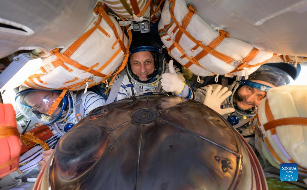 NASA astronaut Mark Vande Hei (L) poses with Russian cosmonauts Pyotr Dubrov (R) and Anton Shkaplerov inside their Soyuz MS-19 manned spacecraft after it landed in an area southeast of the town of Dzhezkazgan, Kazakhstan, March 30, 2022. After extending the record for the longest single spaceflight in history by an American to 355 days, NASA astronaut Mark Vande Hei returned to Earth on Wednesday with two Russian crewmates. Vande Hei departed the International Space Station along with Russian cosmonauts Anton Shkaplerov and Pyotr Dubrov at 3:21 a.m. Eastern Day Time (EDT), and made a safe, parachute-assisted landing at 7:28 a.m. EDT southeast of the remote town of Dzhezkazgan, Kazakhstan, according to NASA. (NASA/Bill Ingalls/Handout via Xinhua)