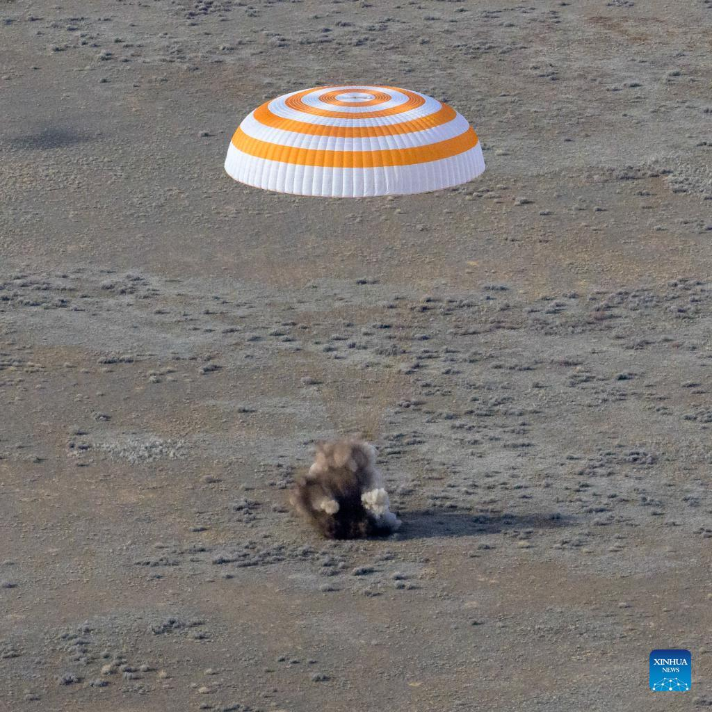 The Soyuz MS-19 manned spacecraft is pictured landing in an area southeast of the town of Dzhezkazgan, Kazakhstan, March 30, 2022. After extending the record for the longest single spaceflight in history by an American to 355 days, NASA astronaut Mark Vande Hei returned to Earth on Wednesday with two Russian crewmates. Vande Hei departed the International Space Station along with Russian cosmonauts Anton Shkaplerov and Pyotr Dubrov at 3:21 a.m. Eastern Day Time (EDT), and made a safe, parachute-assisted landing at 7:28 a.m. EDT southeast of the remote town of Dzhezkazgan, Kazakhstan, according to NASA. (NASA/Bill Ingalls/Handout via Xinhua)
