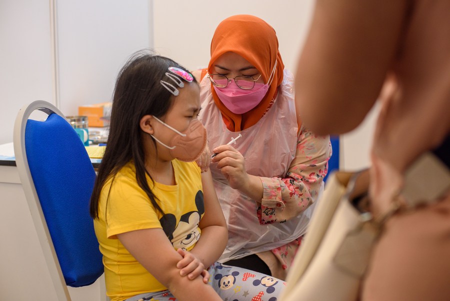 A child receives a dose of COVID-19 vaccine in Kuala Lumpur, Malaysia, Feb. 13, 2022. (Photo by Chong Voon Chung/Xinhua)